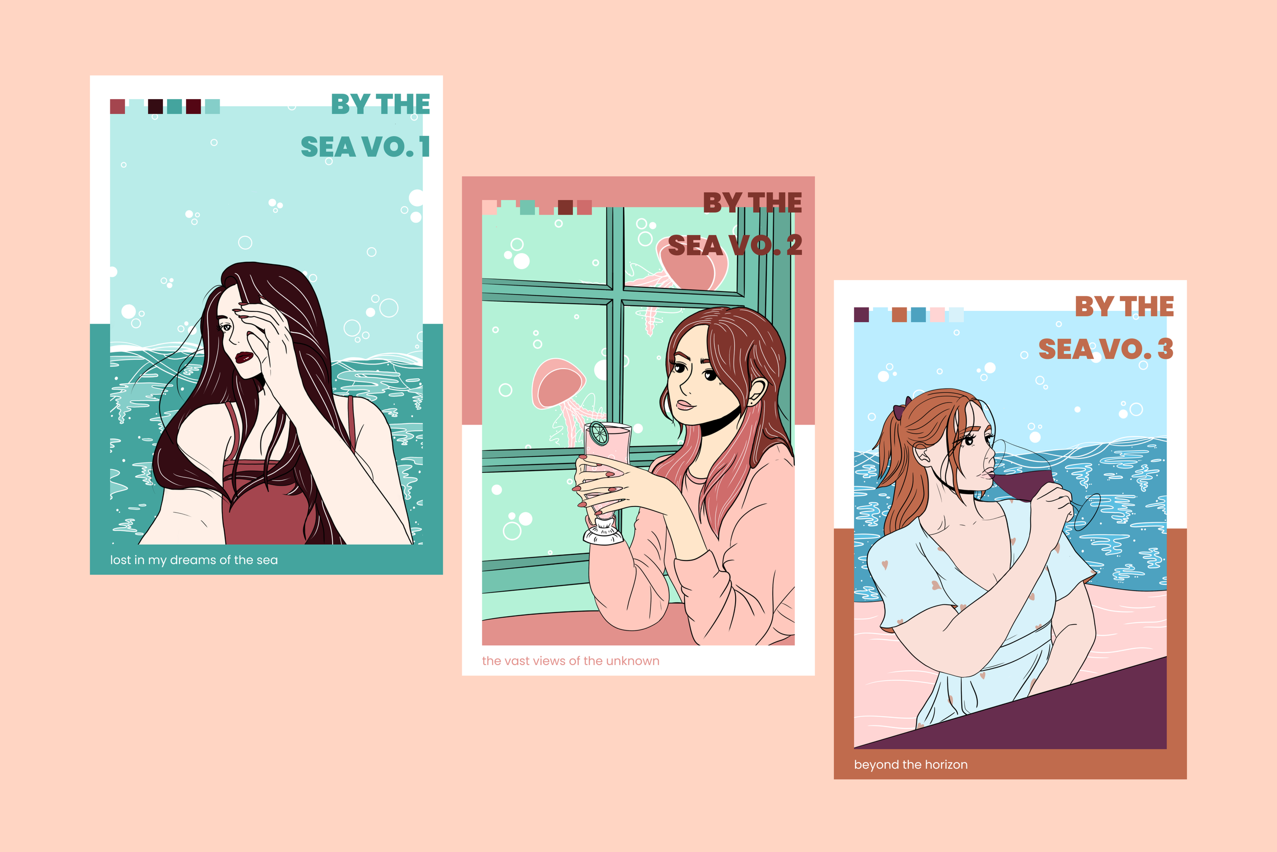 A collection of coastal-inspired illustrations. Unified colour schemes and thoughtful design create a cohesive, immersive narrative, inviting viewers on a journey of seaside experiences.