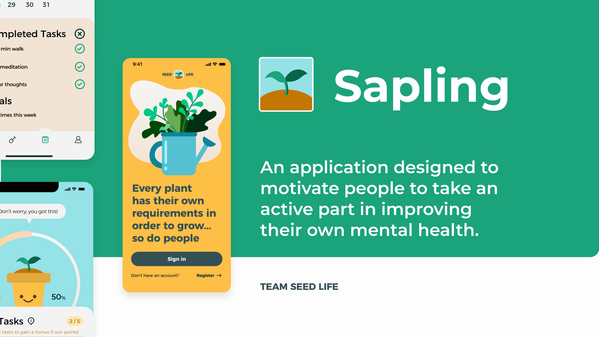 Inspired by personal experiences with declining mental health during the pandemic, Sapling is an application that encourages users to adopt healthy habits and rewards them with tangible growth in the form of a virtual garden. Our involvement in the designathon not only allowed us to refine our UX/UI skills but also expanded our knowledge, contributing to the creation of a meaningful and impactful project. We had the opportunity to implement lean methodology to efficiently utilize the design process to quickly design an application that can be iterated upon submission. Sapling represents our dedication to addressing mental health challenges through creative and user-friendly solutions.