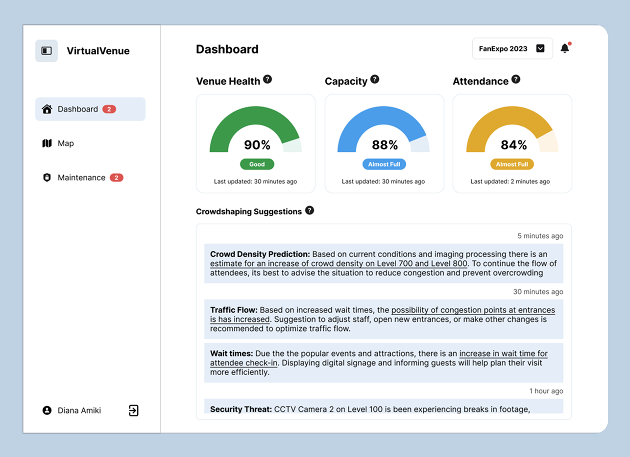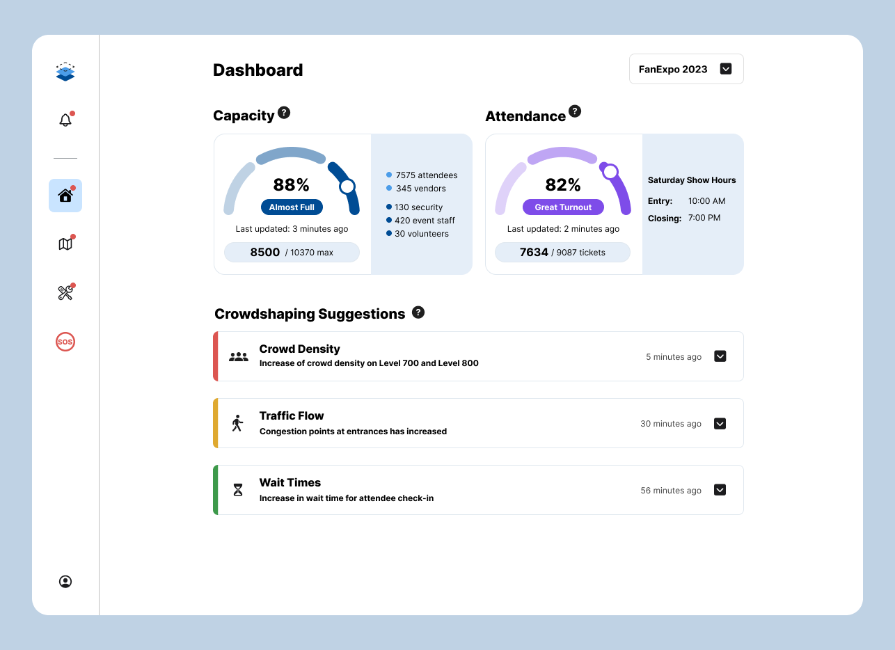 Displays real-time attendance, capacity, and AI-generated crowdshaping suggestions.